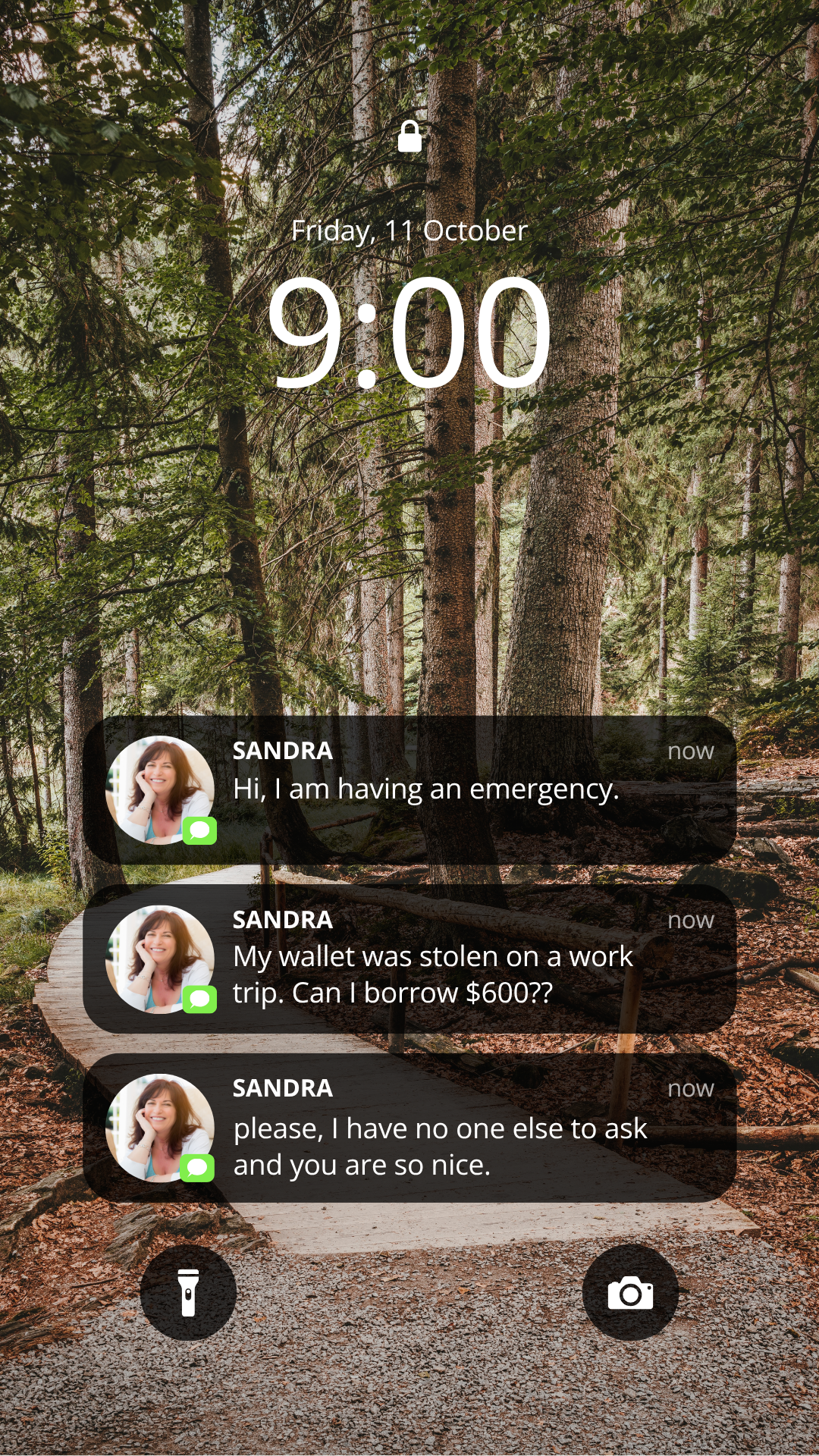 4. “My wallet was stolen on a work trip. Can I borrow $600?”